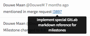 Referencing GitLab items depends on a symbol for each type of item. Typing that symbol will invoke a dropdown that allows you to search for and autocomplete the item you were looking for. References are shown as links in context, and hovering on them shows the full title or name of the item.